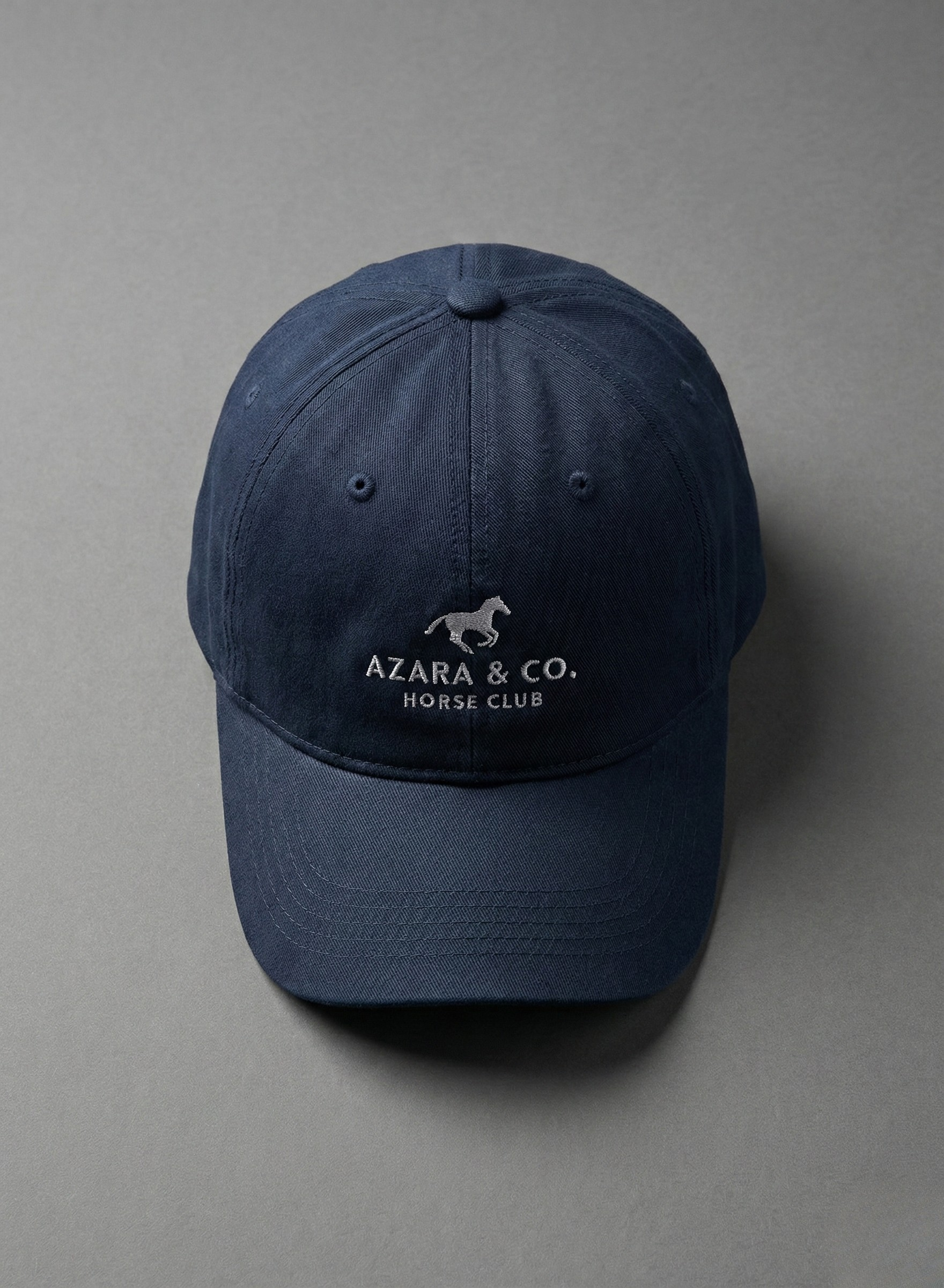 Complete your equestrian look with the Navy Paddock Cap. Featuring a classic silhouette in deep navy with 'Azara & Co. Horse Club' embroidery, this cap is designed for both stable days and street wear. The adjustable strap ensures a custom fit.